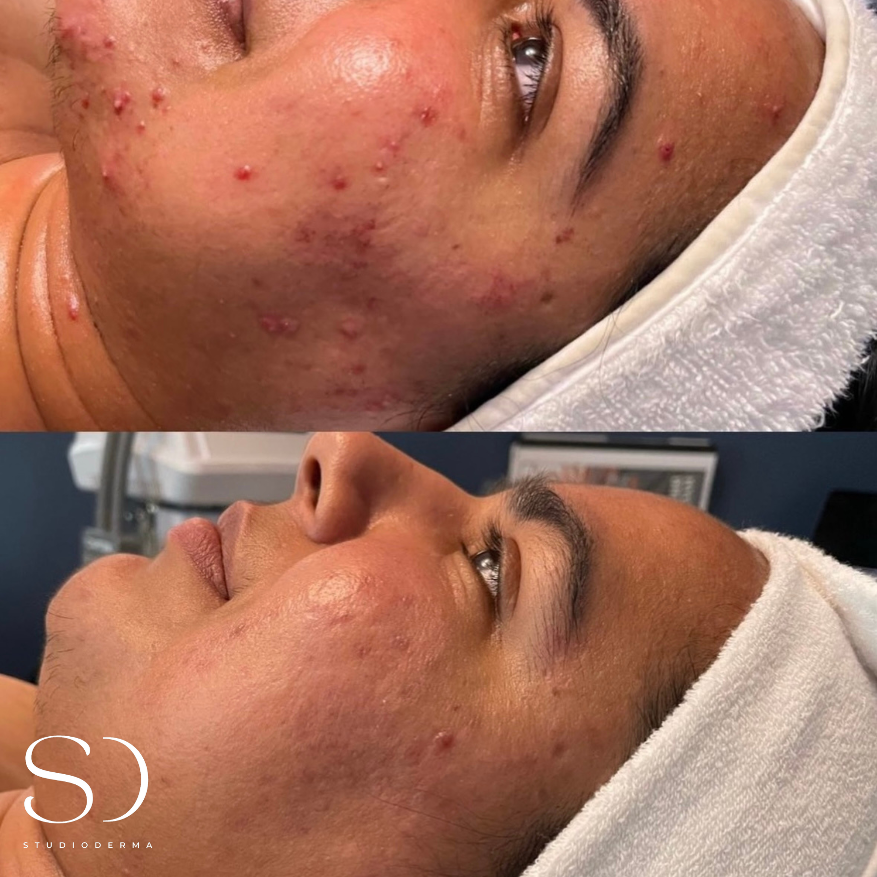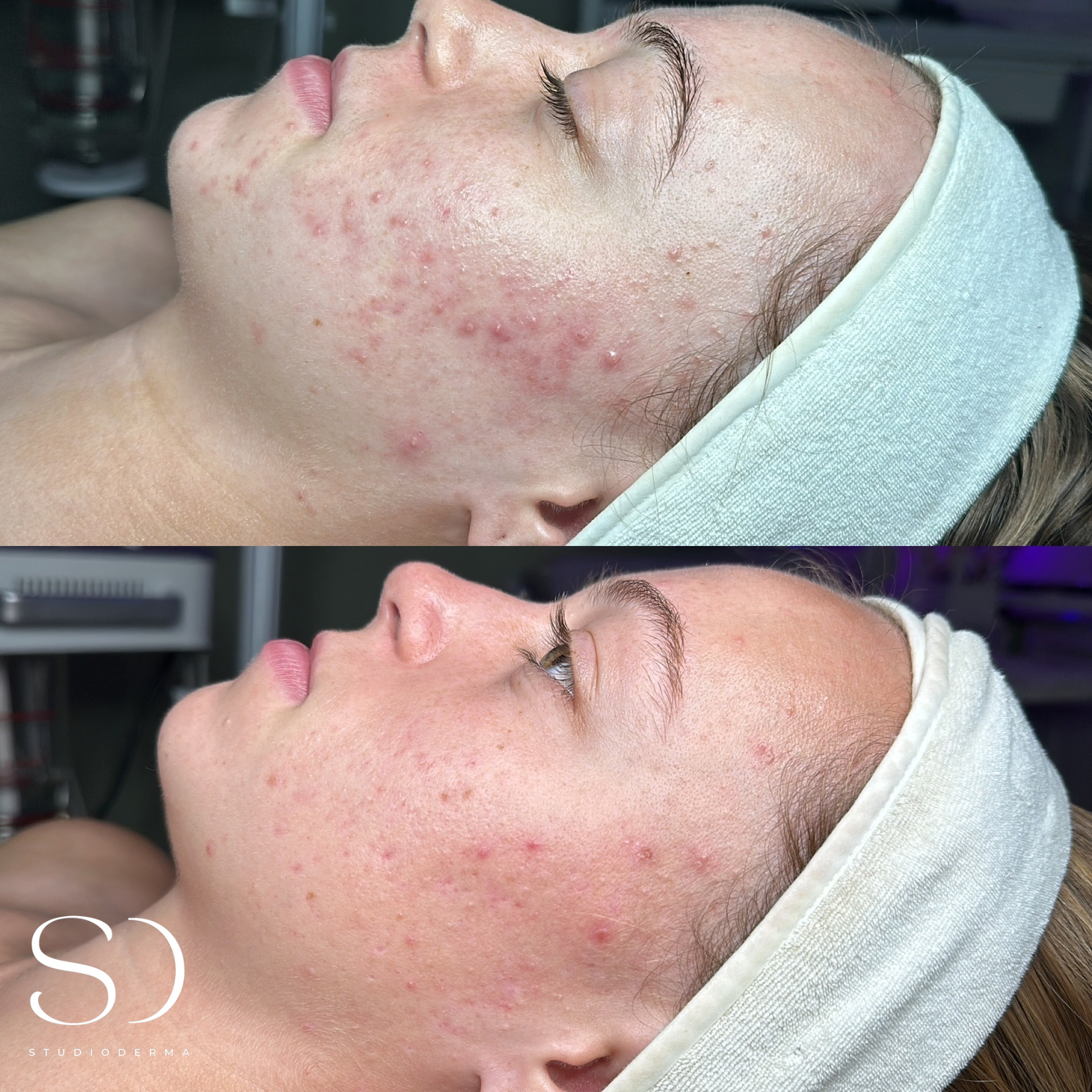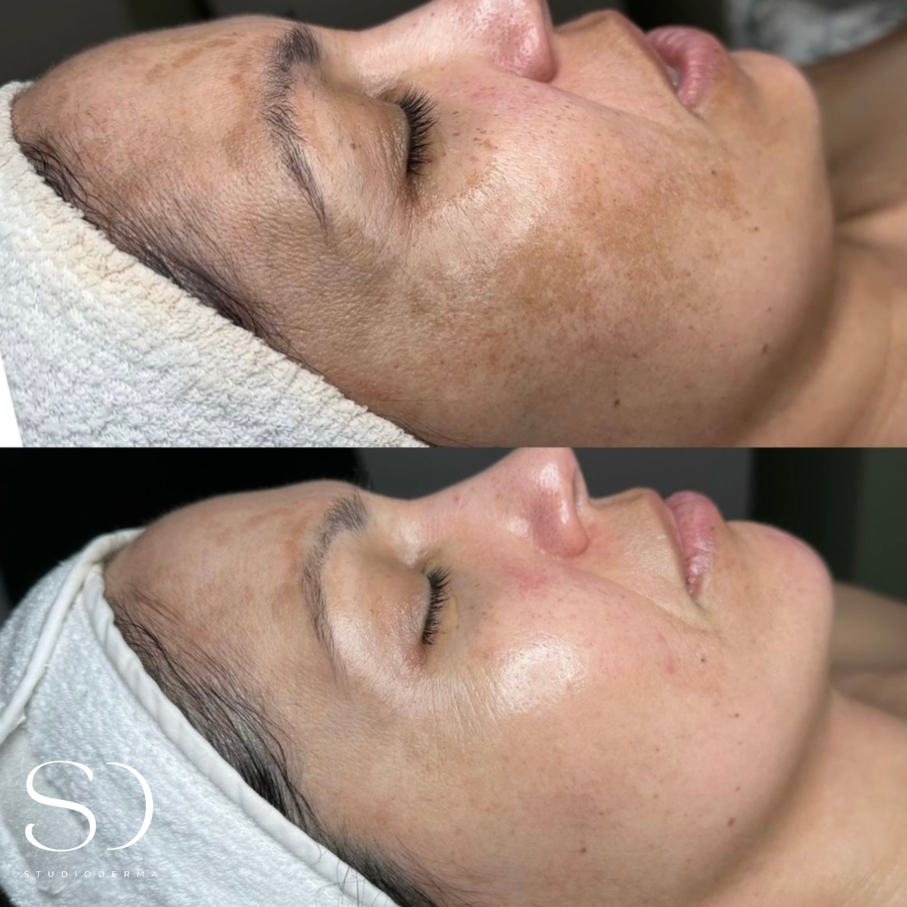 At STUDIODERMA, we celebrate the unique journey of each individual client towards their skin goals. These before and after photos show the transformative potential of the Custom Correction facial treatment alongside the use of a Lira Clinical homecare regimen, and mild lifestyle changes.